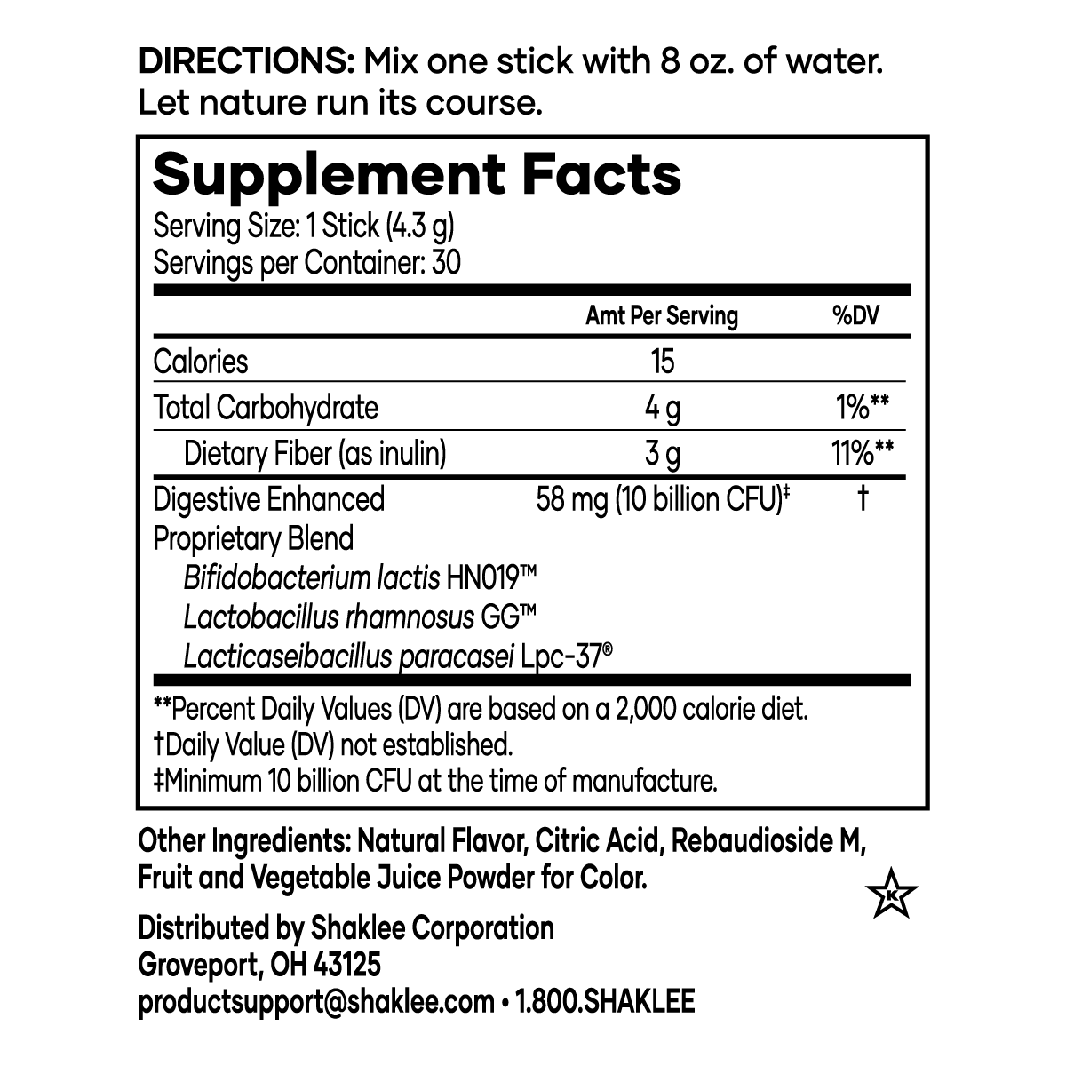 Delivers 10 billion CFUs of three clinically proven probiotic strains—Bifidobacterium lactis HN019, Lactobacillus rhamnosus GG, and Lacticaseibacillus paracasei Lpc-37®—plus 3 g of the prebiotic fiber inulin, all in a convenient stick pack.